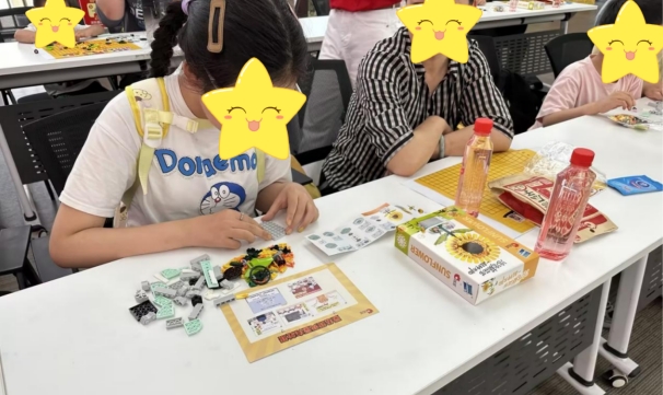 参观后,孩子们被引向由主办方精心策划的多功能活动场所进行互动环节。在这里,工作人员准备了特制的向日葵乐高积木,二十多名小朋友在家长和老师的指导下,迅速投入到积木搭建的乐趣中。这一过程不仅锻炼了他们的触觉、视觉和动作协调能力,还激发了他们的想象力和合作精神。