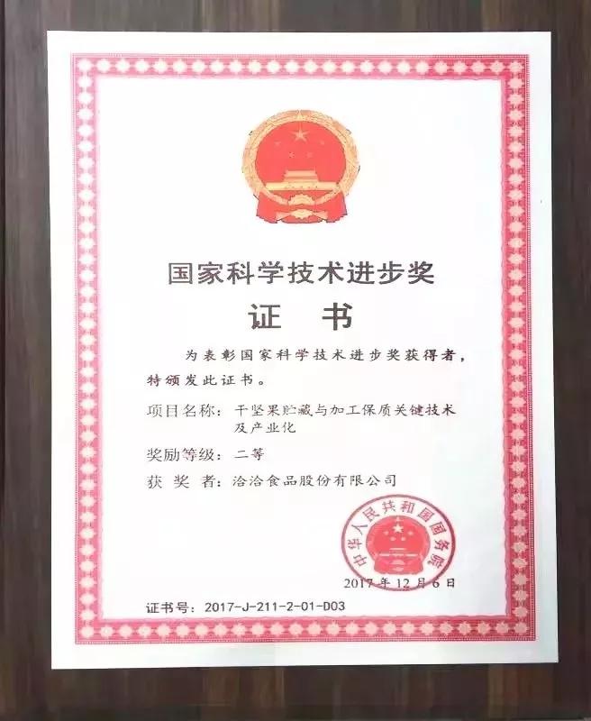 洽洽在坚果行业产业链研究中赢得了多个国家级的荣誉与肯定:洽洽“干坚果贮藏与加工保质关键技术及产业化”项目荣获国务院颁发的“国家科学技术进步奖”;联合中国营养学会成立“中国坚果营养研究中心”,引领中国坚果行业健康发展;洽洽食品还成功入选为国家农业部“国家干坚果加工技术研发中心”;成为首家入选“国家健康品牌计划”的每日坚果品牌。