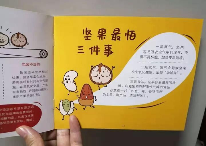 为此,《坚果营养白皮书》采用轻松幽默的图文风格、以洽洽小黄袋的黄色为主色调,带给读者耳目一新的感受。在内容上,以对坚果富含的成分分析为出发点,介绍了吃坚果为人体所带来的益处、不同的坚果所具有的不同功效、每种坚果的正常摄入量并明确标明坚果的“新鲜”的重要性,书中强调新鲜的、无添加的坚果才是营养的健康的。