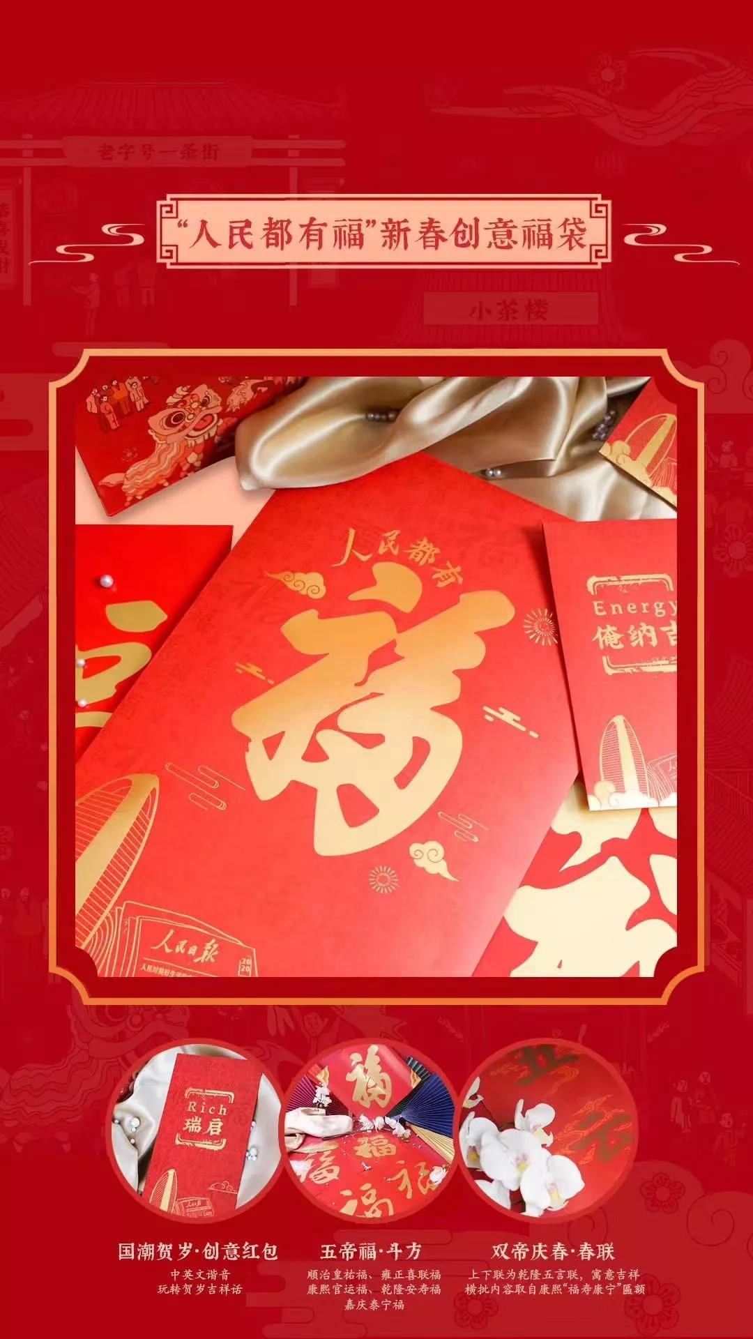 新春福袋设计秉承“人民纳福,福满新春”原则,以极具创意和新春底蕴的元素,营造万福献瑞的喜庆氛围。