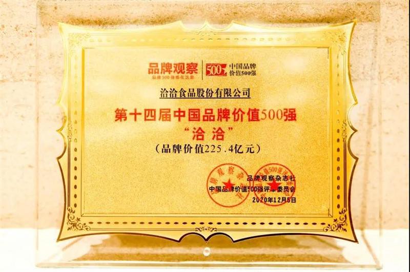 第十四届中国品牌价值500强评选活动由品牌观察、品牌观察研究院、品牌观察商学院、中国品牌日报、中国品牌日万里行组委会共同组成的中国品牌价值500强评审委员会独立完成。其为众多中国企业提供品牌价值评估展示服务,积累了丰富的实操经验,得到了华为、格力、双汇等500强企业的认可。经中国品牌价值500强评审委员会评估,洽洽(洽洽食品股份有限公司)品牌价值为225.4亿元,上榜中国品牌价值500强。