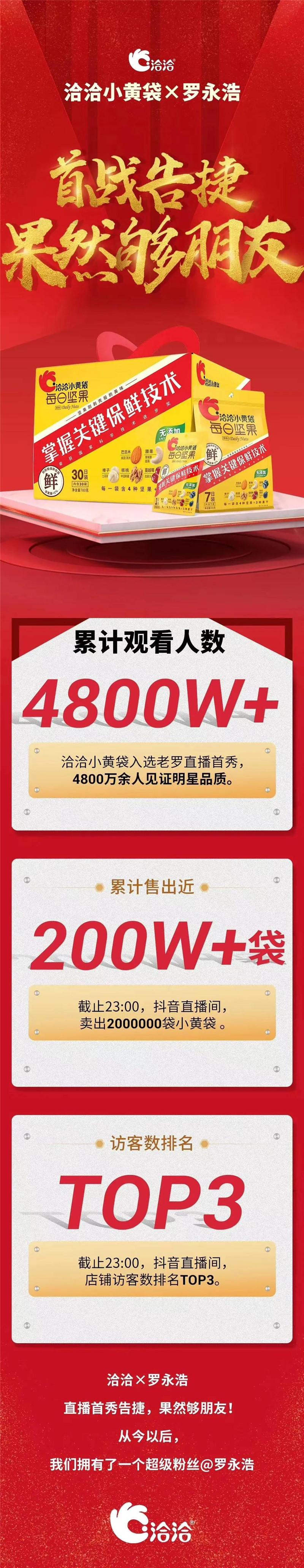 事实证明,洽洽食品和罗永浩交个朋友,无疑是正确的选择。新鲜的产品,再加上老罗的倾情推荐,4月1日直播当晚,直播间累计观看人数超过4800万,总成交额超过1.1亿元。短短3小时,洽洽小黄袋就卖出了200多万袋。无论是从销售业绩来看,还是从品牌理念与产品价值传达方面来看,牵手罗永浩,都是一件值得的事情。