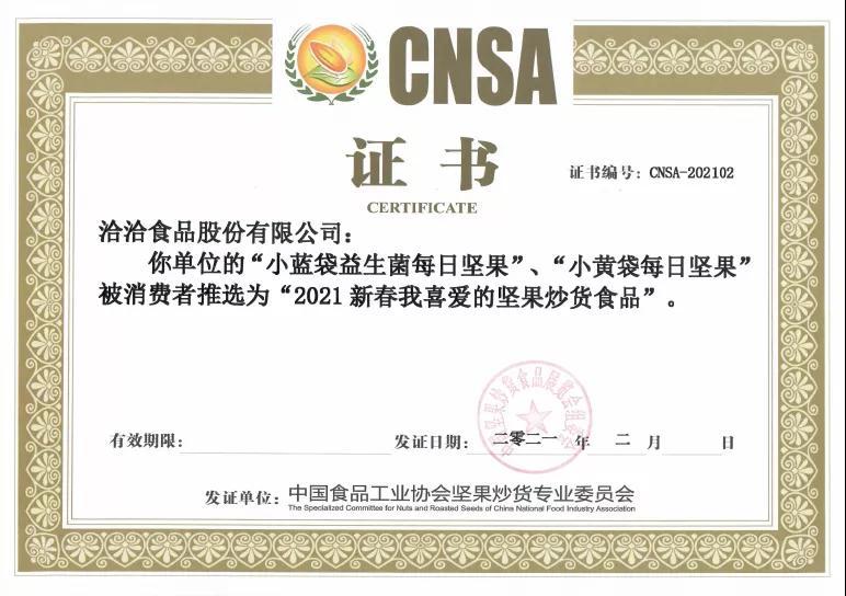 2月5日,“2021新春我喜爱的坚果炒货食品”推选活动取得圆满成功,洽洽食品的“小蓝袋益生菌每日坚果”和“小黄袋每日坚果”被消费者推选为“2021新春我喜爱的坚果炒货食品”。