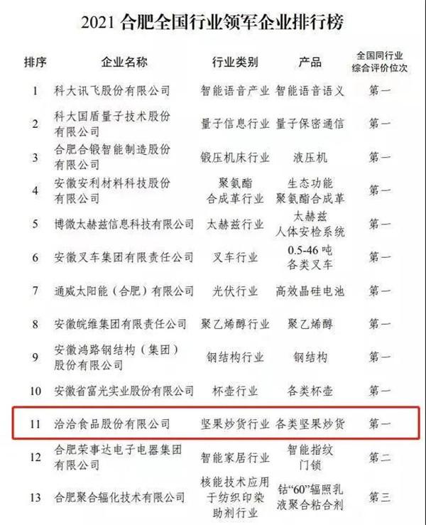 洽洽食品股份有限公司上榜“2021合肥农业企业20强”、“2021合肥全国行业领军企业”!其中,洽洽更是在2021合肥全国行业领军企业排行榜中的坚果炒货行业排行第一!
